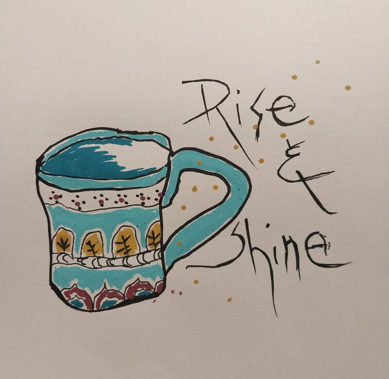 I had so much fun doing my first piece! Inspired by the cup I drink my morning tea in. The result is sloppy, happy, and with its little message. If I had tried to draw a true-to-life image of my cup, it wouldn’t have turned out looking anywhere near as good, as I don’t have the talent that is required. Kunio’s viewpoint is that it shouldn’t take a certain talent to create. It should just take joy. Surprisingly, it was the letters that were the most difficult to do.